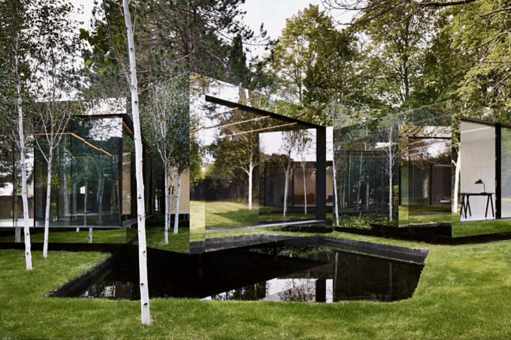 - Fachadas espejadas o reflectantes: reflejan el entorno y hacen que la casa “desaparezca” a la vista.
