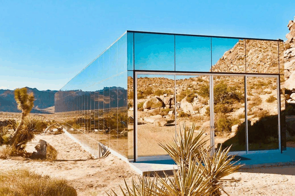Una villa de lujo en pleno desierto, con paredes reflectantes que devuelven la imagen de las dunas y el cielo.