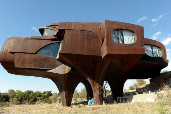 Construida en los años 70, esta casa de estilo orgánico se compone de bóvedas redondeadas cubiertas con hormigón pintado de naranja y púrpura. Desde fuera parece un conjunto de cuevas futuristas.