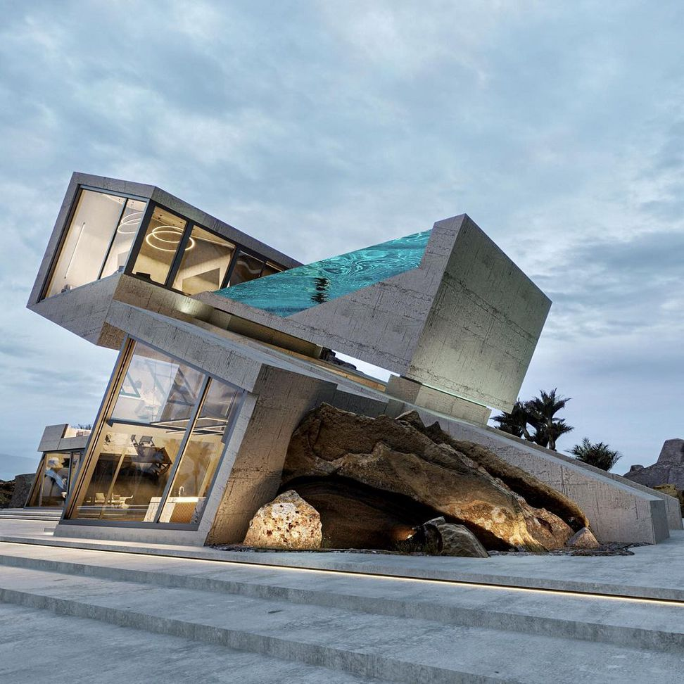 Aunque todavía no se ha construido por completo, este proyecto griego se volvió viral. La casa se “entierra” literalmente dentro de un acantilado, dejando solo un techo de vidrio que sirve como piscina.