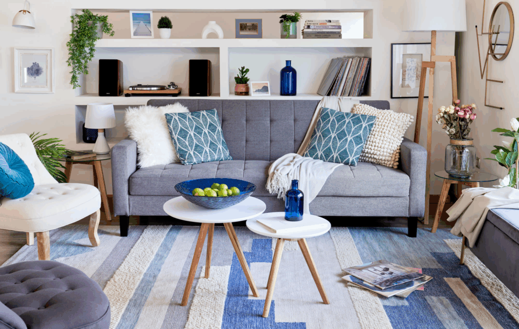 - Alfombras: delimitan espacios y aportan color y textura.